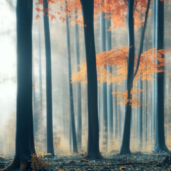 Las jesienią. Na jednym z drzew znajduje się gałąź z pięknymi, kolorowymi, jesiennymi liśćmi.
