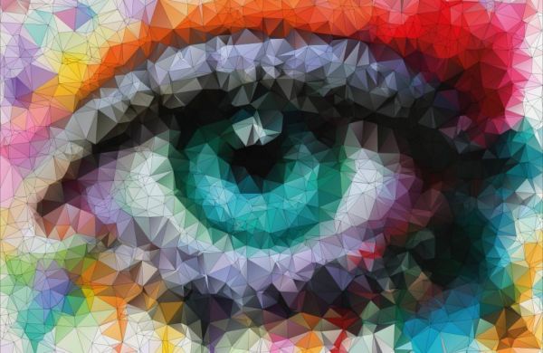 Unikalna fototapeta z abstrakcyjnym okiem złożonym z kolorowych trójkątów.