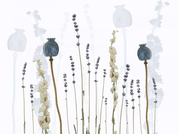 Senna kolekcja flory, przedstawiona z miękkością przypominającą akwarelę. Kompozycja obrazu przedstawia cebulki maku i lawendę, których odcienie od błękitu nieba do bieli przypominającej chmury tworzą eteryczny ogród. Półprzezroczyste tło i nakładające się na siebie elementy sugerują senny, spokojny stan, który zachęca do refleksji i wyciszenia.