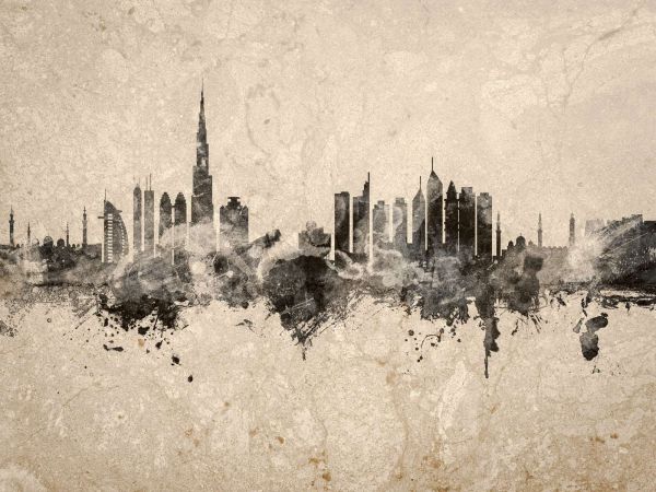 Akwarelowa panorama Dubaju w stylu miejskim. Panorama jest dostępna z różnymi tłami.