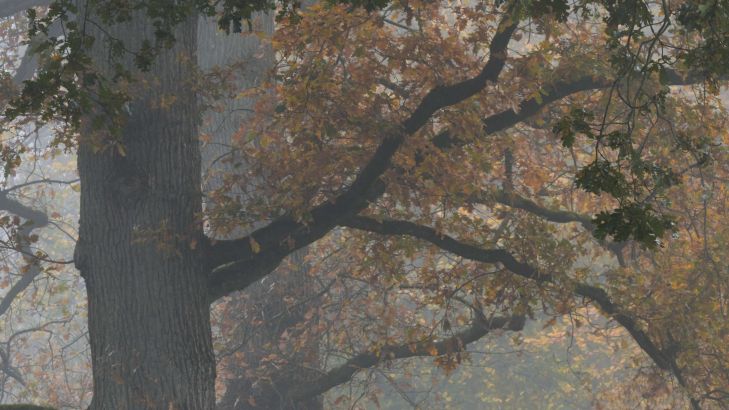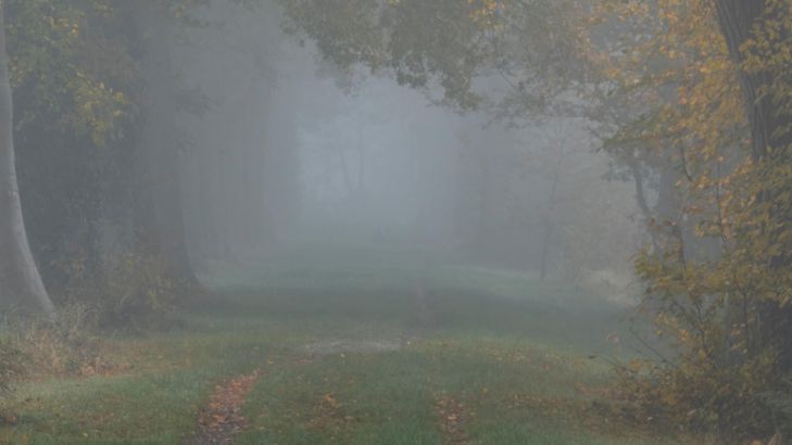 Aleja z drzewami we mgle w okresie jesiennym. Z tą fototapetą w domu jest tak, jakbyś mógł wejść do lasu.