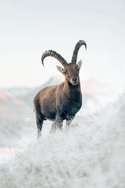 Portret alpejskiego kozła w mroźny poranek. Kilka pofałdowanych gór i wzgórz w tle.