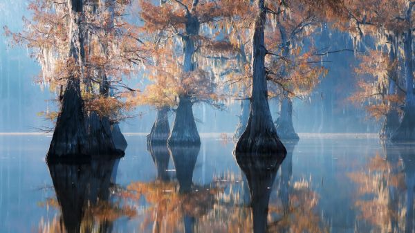 Fototapeta jezioro z drzewami. Między drzewami lekka mgła wisi nad wodą czyniąc to zdjęcie tajemniczym.