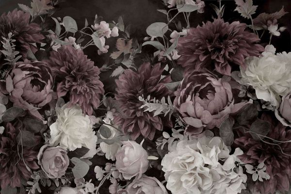 To luksusowy projekt łączy ponadczasowe piękno piwonii i róż z głęboką, ciepłą paletą kolorów. Bordowe i śliwkowe kwiaty tworzą bogaty i dramatyczny wygląd, podczas gdy kremowe róże i przygaszone liście zapewniają delikatny kontrast. Ciemne tło dodaje odrobinę tajemniczości, sprawiając, że całość przypomina klasyczne martwe natury z malarstwa.