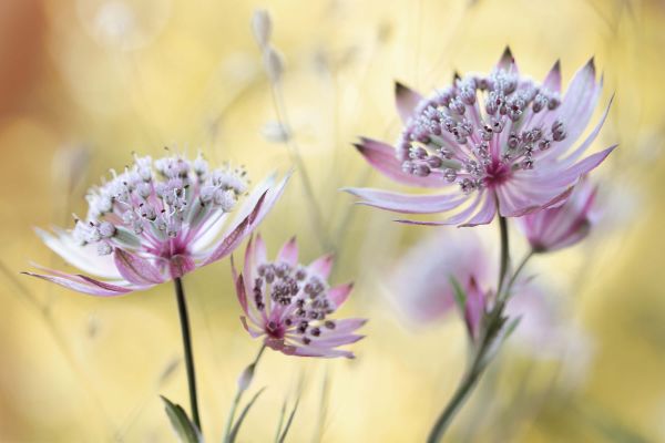 Astrantia Major na fototapecie. Zbliżenie na piękne różowe kwiaty, które można połączyć z tą tapetą, aby stworzyć jeszcze bardziej nastrojowe środowisko wewnętrzne.