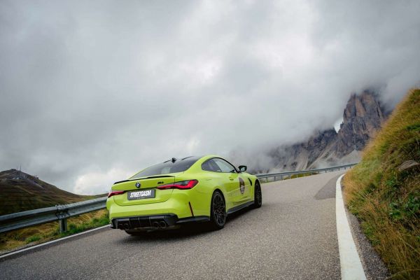 Jasnozielone sportowe coupé wspina się w górę krętej górskiej drogi, otoczone groźnymi chmurami i surowymi szczytami gór. Mgła zasłania wierzchołki, podczas gdy samochód stanowi wyraźny kontrast z dramatycznym krajobrazem. Idealna mieszanka prędkości, przygody i natury.