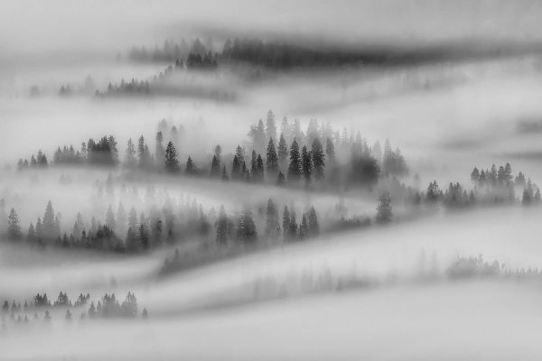 Zamglony czarno-biały obraz z drzewami. Połącz to w salonie lub sypialni.