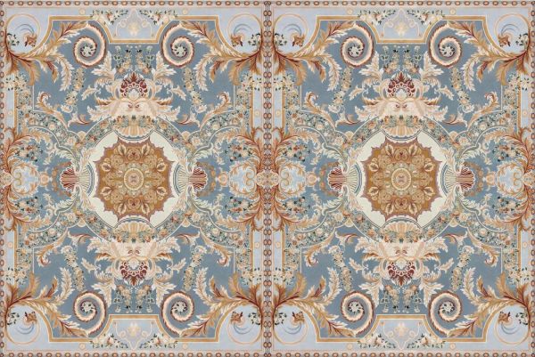 Bogato zdobiony barokowy wzór z symetrycznymi zawijasami, motywami roślinnymi i eleganckimi medalionami na miękkim błękitnym tle. Ciepłe akcenty w kolorze złota, terakoty i kremu nadają całości elegancki i klasyczny wygląd.