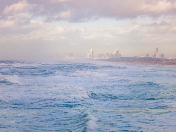 Plaża Bat-Yam w Izraelu. W oddali na morzu widać sztorm.