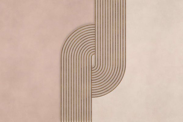 Wyrafinowana gra linii złocistych łuków i pionowych pasów na ciepłym beżowym tle. Symetryczne formy i subtelny połysk tworzą elegancki, geometryczny wygląd o spokojnej, lecz luksusowej atmosferze.