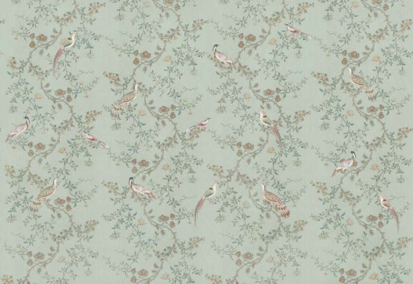 Elegancki wzór z ozdobnymi bażantami spoczywającymi na wyrafinowanych gałązkach kwiatów, oprawiony w delikatne tło w kolorze miętowym z subtelnymi, naturalnymi akcentami w starym różu, okrzei i jadeicie. Ilustracyjny styl nadaje całości klasyczny i wyrafinowany wygląd z romantycznym, niemal baśniowym charakterem.