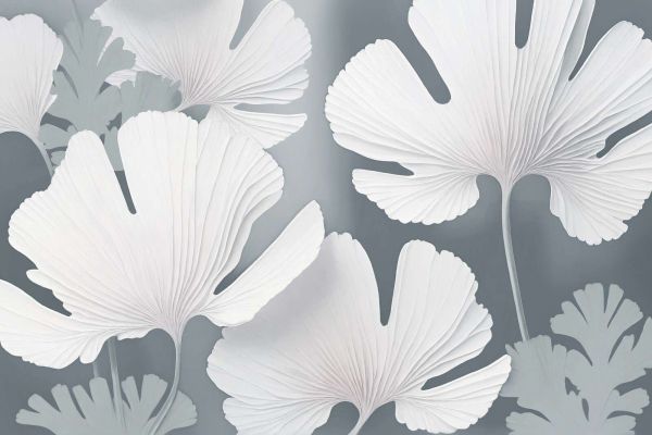 Duże, wachlarzowate liście miłorzębu dwuklapowego w miękkiej bieli i jasnoszarych odcieniach unoszą się nad chłodnym, mglistym tłem. Delikatne żyłki i subtelne cienie nadają całości spokojny, niemal rzeźbiarski i błogi wygląd.