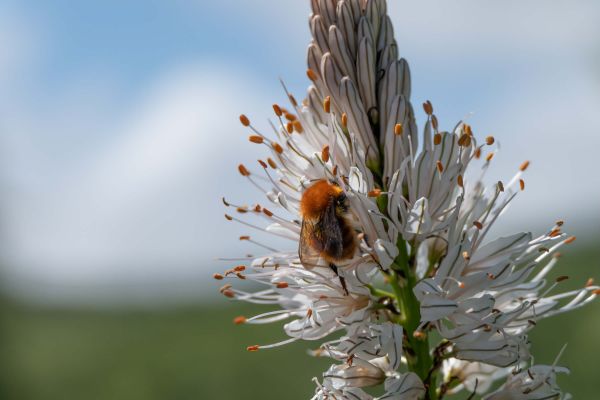 Obraz przedstawiający trzmiela zapylającego kwiaty.