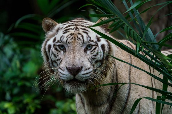 Zdjęcie białego tygrysa w zbliżeniu z dżunglą w tle.