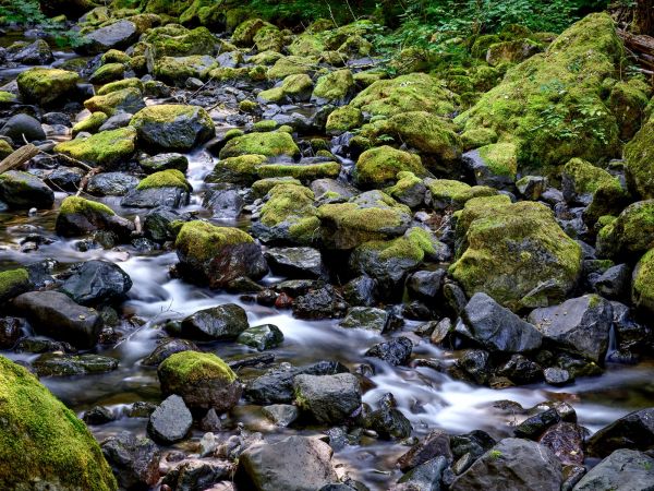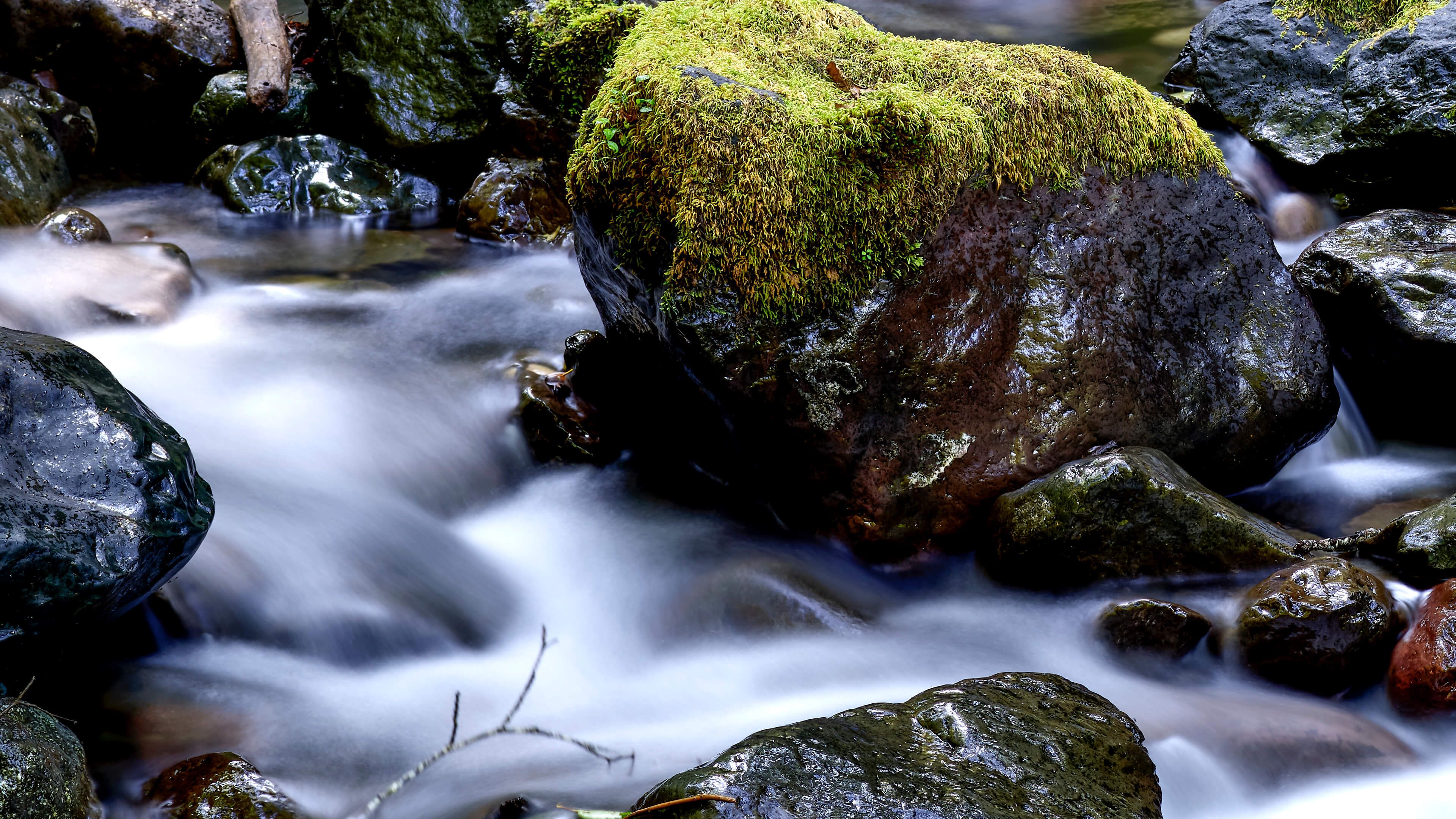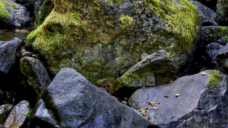 Bieżąca woda między głazami. Niektóre głazy pokryte są zielonym mchem.