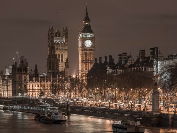 Big Ben i Westminster Abby wieczorem. Połącz tę fototapetę w swoim salonie lub sypialni.