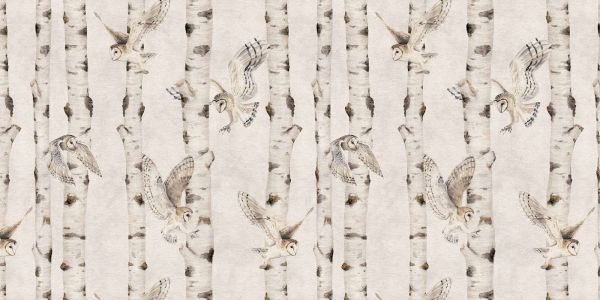 Nastrojowy wzór z latającymi sowami między smukłymi brzozami. Szczegółowe ilustracje i naturalne kolory ożywiają spokój i mistykę lasu, idealne dla spokojnego i eleganckiego wyglądu w każdej przestrzeni.