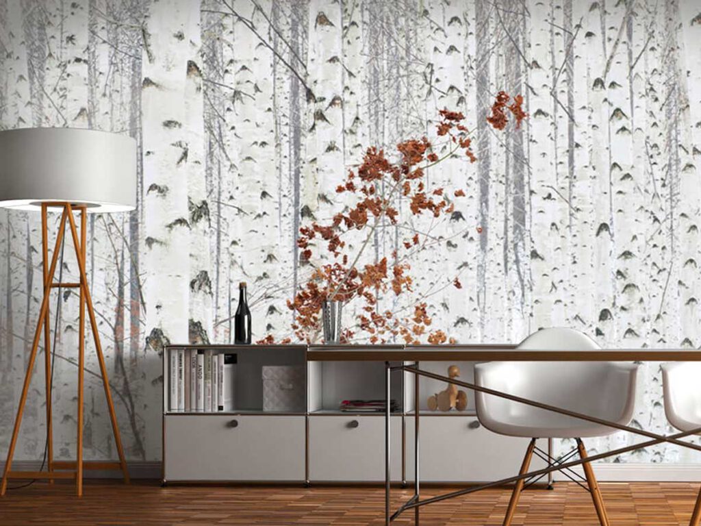 Nie masz odwagi lub ochoty na zbyt intensywny nadruk na ścianie? W takim razie fototapeta z bukami w zimowym krajobrazie może być dobrym wyborem do twojego salonu. Drzewa zapewniają kontrast na ścianie na tle białych pni i jasnego tła. Gałąź z brązowymi liśćmi wyskakuje ze ściany jako uderzający szczegół. Dzięki tej tapecie wybierasz bezpieczną, ale piękną fototapetę do swojego salonu.
