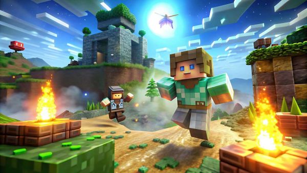 Zaczarowany pikselowy krajobraz oświetlony dużym księżycem. Postacie w kolorowych strojach biegają po pagórkowatym terenie, otoczone ogniskami, kamiennymi ruinami i zieloną roślinnością. Dynamiczna kompozycja emanuje przygodą i tajemnicą.