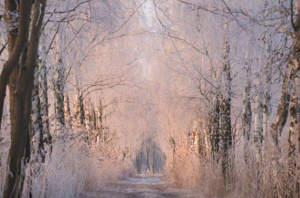 Idylliczna aleja, otoczona drzewami pokrytymi szronem, rozciąga się w dali. Delikatne pastelowe kolory i lodowaty blask tworzą spokojną, niemal bajkową atmosferę.