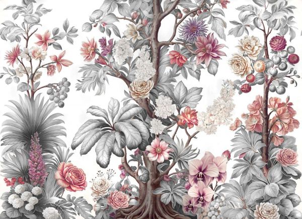 Bogato szczegółowe drzewo kwitnące z kwiatami, liśćmi i owocami w delikatnych odcieniach szarości, kremu i pudrowych tonów. Subtelne akcenty różu i beżu nadają całości elegancki, spokojny wygląd z klasyczną botaniczną atmosferą.