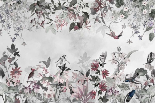 Este hermoso diseño combina elementos naturales como flores, elegantes pájaros y un fondo suave para crear una atmósfera serena y encantadora. Se crea un conjunto armonioso con una paleta de tonos pastel y naturales, como el verde suave, el rosa claro y los sutiles tonos tierra. Los detalles de pájaros revoloteando y motivos botánicos añaden una sensación dinámica pero discreta. Ideal para un salón o dormitorio donde se desee tranquilidad y elegancia, o para darle un aspecto único a un espacio de oficina. Combine este diseño con muebles y accesorios neutros, como detalles en madera o telas de lino, para acentuar los elementos naturales. Esta composición atemporal es adecuada tanto para interiores modernos como clásicos.