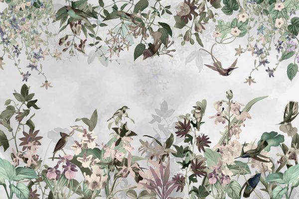 Este hermoso diseño combina elementos naturales como flores, elegantes pájaros y un fondo suave para crear una atmósfera serena y encantadora. Se crea un conjunto armonioso con una paleta de tonos pastel y naturales, como el verde suave, el rosa claro y los sutiles tonos tierra. Los detalles de pájaros revoloteando y motivos botánicos añaden una sensación dinámica pero discreta. Ideal para un salón o dormitorio donde se desee tranquilidad y elegancia, o para darle un aspecto único a un espacio de oficina. Combine este diseño con muebles y accesorios neutros, como detalles en madera o telas de lino, para acentuar los elementos naturales. Esta composición atemporal es adecuada tanto para interiores modernos como clásicos.