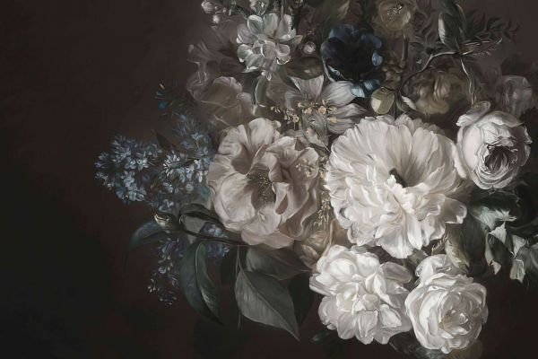 To wspaniałe dzieło ożywia klasyczne piękno martwej natury z kwiatami. Wyszukane róże, piwonie i kwiaty w delikatnych odcieniach kremu i ziemi wspaniale kontrastują z ciemnym tłem, podczas gdy subtelne akcenty niebieskiego i zielonego nadają całości dodatkowy wymiar. Szczegółowe pociągnięcia pędzla i realistyczne tekstury tworzą atmosferę przypominającą malarstwo z okresu baroku, w którym kwiaty były uwieczniane jako symbole przemijania i elegancji.