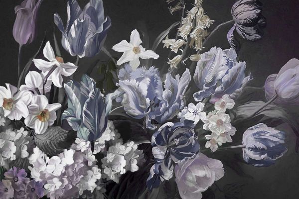 Elegancka i wyrafinowana martwa natura z tulipanami, narcyzami i kwiatami w odcieniach niebiesko-szarych i fioletowych. Ciemne tło tworzy dramatyczny kontrast, dzięki czemu subtelne pociągnięcia pędzla i delikatne detale jeszcze bardziej się wyróżniają. Ponadczasowa i luksusowa kompozycja o klasycznym wyglądzie.