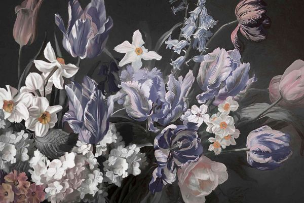 Elegancka i klasyczna martwa natura z dostojnymi tulipanami, narcyzami i kwiatami w bogatych odcieniach niebieskiego, fioletowego i kremowego. Ciemne tło wzmacnia dramatyczny kontrast i nadaje projektowi ponadczasowy i wyrafinowany wygląd. Idealna do luksusowego i artystycznego wnętrza.
