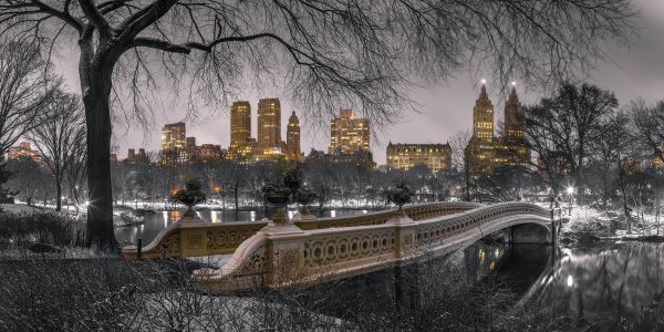 Central Park i Manhattan wieczorem. Zdjęcie jest czarno-białe z kolorem nad mostem i budynkami.