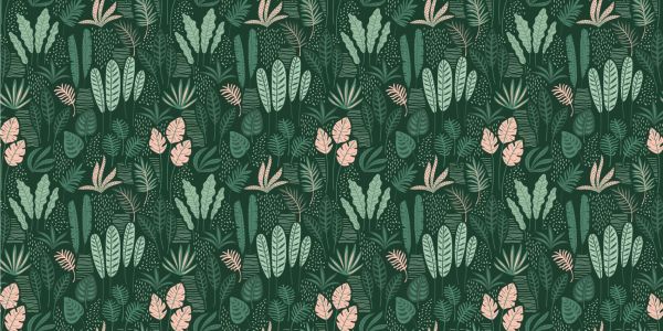 Wesoły wzór z różnymi liśćmi w kolorach zielonym i różowym.