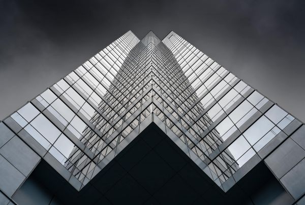 Fototapeta widoku z dołu na bardzo wysoki budynek. Połącz to w salonie.
