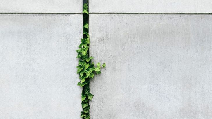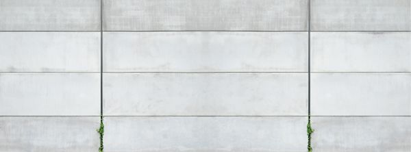 Zdjęcie panoramiczne ściany z płyt betonowych. Unikatowym detalem jest zielona roślina.