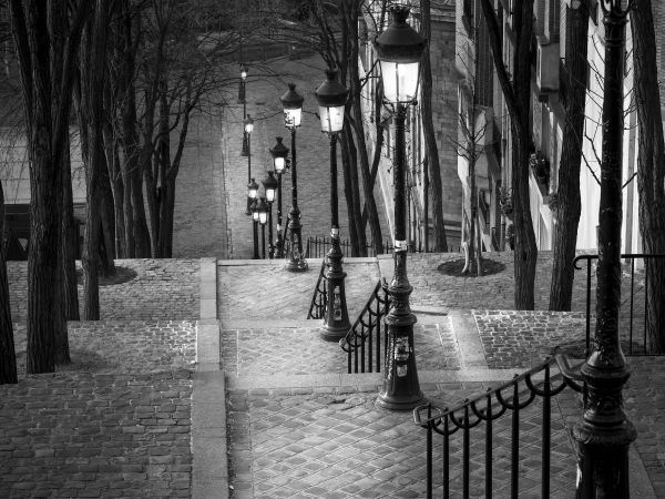 Spokojny wieczór przy słynnych schodach w Montmarte. Połącz tę fototapetę w swojej sypialni lub salonie.