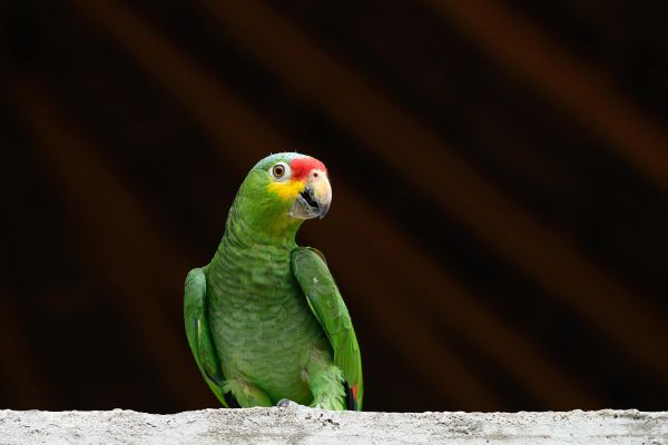 Papuga amazonka spoglądająca z zaciekawieniem w stronę kamery. Dzięki czarnemu tłu papuga jest dobrze widoczna.