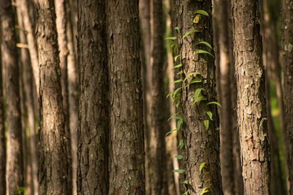 Wandkleed met een close-up van een aantal dunne bomen naast elkaar. Uit één stam ontspruiten nieuwe groene blaadjes