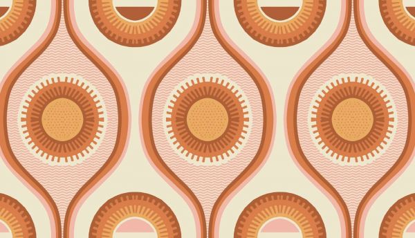 To wyraźne wzornictwo łączy retro styl z ciepłymi, słonecznymi kolorami, które natychmiast wywołują radosny i energetyczny nastrój. Centralnie umieszczone motywy słoneczne składają się z koncentrycznych pierścieni w odcieniach takich jak terrakota, morelowy, piaskowy żółty i pudrowy róż. Wewnętrzne koła zawierają drobne struktury kropek, dodając do ogólnej geometrycznej struktury zabawnego detalu. Falujące linie między motywami wprowadzają uczucie ruchu i powtarzalności, nie sprawiając wrażenia przytłaczającego. Dzięki ciepłemu, naturalnemu wyborowi kolorów i zabawnej formie, ten wzór doskonale nadaje się do wnętrz o vintage, boho lub skandynawskiej estetyce. Pomyśl o jasnych drewnianych podłogach, krzesłach z rattanu, dodatkach w odcieniu okeru i poduszkach z graficznymi wzorami, tworząc zabawną, domową atmosferę. Nawet w bardziej minimalistycznym wystroju ten wzór może pełnić rolę silnego akcentu wizualnego. W połączeniu z prostymi, neutralnymi meblami w odcieniach beżu lub jasnoszarego oraz delikatnymi detalami miedzianymi lub mosiężnymi, zapewnia ciepłą równowagę między spokojem a charakterem. Ten wzór doskonale sprawdza się w pełnych życia przestrzeniach, takich jak kuchnia, kącik zabaw, miejsce do pracy w domu czy pokój dziecięcy. Dzięki organicznym kształtom i delikatnym rytmom, wzór promieniuje pozytywnością, nie stając się krzykliwym. Idealny dla miłośników retro wzorów z nowoczesnym zacięciem.