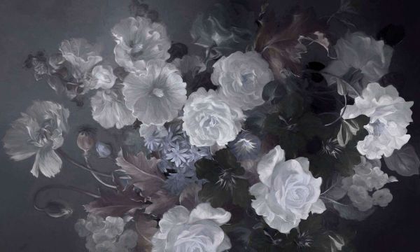 To projekt z kwiatowym wzorem łączy klasyczną elegancję z mistycznym i ponadczasowym wyglądem. Delikatne róże, maki i inne kwiaty w chłodnych odcieniach bieli, szarości i niebieskiego wspaniale kontrastują z głębokim, ciemnym tłem, tworząc dramatyczny i nastrojowy efekt. Miękkie pociągnięcia pędzla i subtelne przejścia kolorów nadają całości malarski i niemal marzycielski klimat, inspirowany starymi mistrzami malarstwa. Dzięki stonowanym i eleganckim kolorom ten wzór doskonale wpisuje się w klasyczne, nowoczesne lub romantyczne wnętrze. Połączenie ciemnych odcieni i subtelnie oświetlonych kwiatów tworzy luksusowy i wyrafinowany wygląd, który dobrze współgra z materiałami takimi jak aksamit, marmur i ciemne gatunki drewna. W minimalistycznym wnętrzu ten wzór może być stylowym punktem centralnym, podczas gdy w vintage'owym otoczeniu wspaniale komponuje się z antycznymi detalami i ciepłymi metalowymi akcentami. Serene i tajemniczy wygląd sprawia, że ten wzór jest szczególnie odpowiedni do pomieszczeń takich jak sypialnia, salon czy elegancka jadalnia. Ciemne tło dodaje głębi i ciepła, podczas gdy jasne akcenty kwiatowe oferują wyrafinowany kontrast, który nadaje przestrzeni klasyczną i elegancką atmosferę. Aby uzyskać harmonijny całościowy obraz, można dodać akcesoria takie jak srebrne świeczniki, szklane wazy i miękkie, głębokie odcienie niebieskiego w tekstyliach. Ten ponadczasowy i wyrafinowany wzór kwiatowy ożywia piękno klasycznych martwych natur i stanowi stylową podstawę dla eleganckiego i nastrojowego wnętrza.