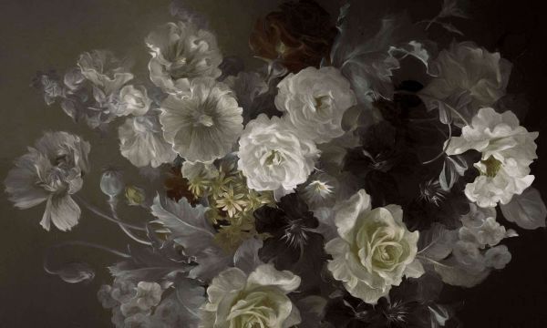 To projekt z bujnym wzorem kwiatowym emanuje klasyczną elegancją i nostalg beauty. Szczegółowe róże i kwiaty, wykonane w delikatnych odcieniach złota, kremu i szarości, tworzą harmonijną i ponadczasową całość. Ciemne tło dodaje dramatycznego efektu i sprawia, że kwiaty jeszcze bardziej się wyróżniają, nadając projektowi tajemniczy i luksusowy wygląd. Malarskie pociągnięcia pędzla i subtelne przejścia kolorów tworzą wyrafinowaną vintage atmosferę, inspirowaną starymi holenderskimi martwymi naturami.