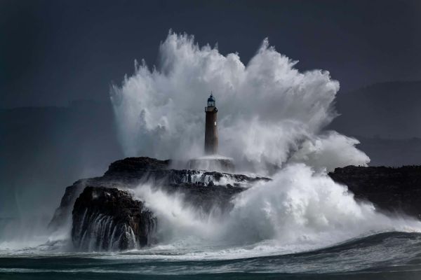 Grzebień na fototapecie. Spektakularny obraz wody wznoszącej się wysoko nad latarnią morską.