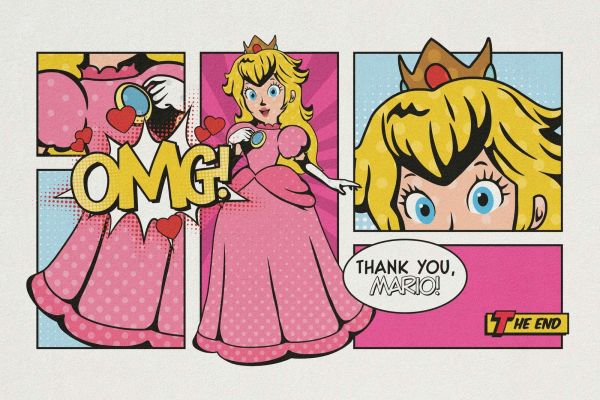 Kolorowy pop-art z księżniczką w komicznym i zabawnym stylu. Jasne kolory i wesołe elementy tworzą energiczną i pozytywną atmosferę, idealną dla miłośników pop-artu i bajek.