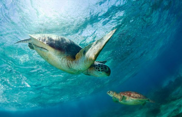 Dwa żółwie w morzu z wysokimi falami. Ta fototapeta wprowadza podwodny świat do Twojego domu.