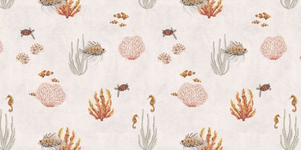 Uspokajający podwodny wzór z kolorowymi rafami koralowymi, tropikalnymi rybami, konikami morskimi i żółwiami. Delikatne brązowe tło i szczegółowe ilustracje tworzą spokojną morską atmosferę, idealną do dodania relaksującego i egzotycznego akcentu do każdej przestrzeni.