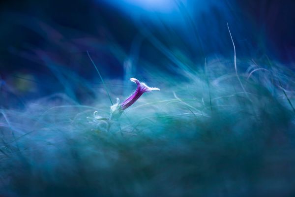 Zbliżenie na fioletowy kwiat w środku pola. Zdjęcie posiada specjalny efekt, który sprawia, że kolory są jaśniejsze.