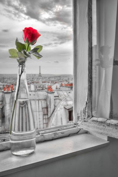 Czerwona róża w oknie z wieżą Eiffla w tle. Zdjęcie jest czarno-białe, z czerwonymi kolorami jako detal.