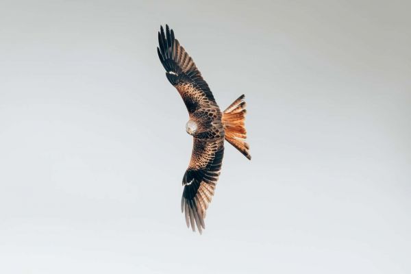 Kania ruda z rozpostartymi skrzydłami. Struktura upierzenia tego drapieżnego ptaka jest wyraźnie rozpoznawalna. Niebo jest czyste i jasnoszare.