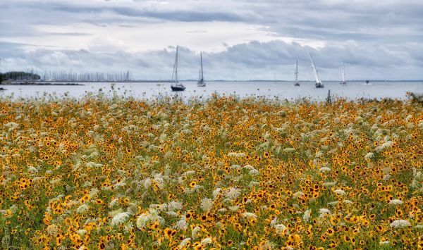 Pole z mniszkami lekarskimi, w tle widać żaglówki.