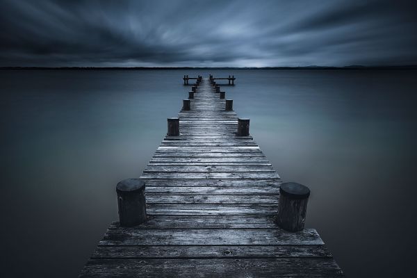 Molo sfotografowane przy zachmurzonym niebie. Boki zdjęcia są ciemne, więc molo dobrze się wyróżnia.