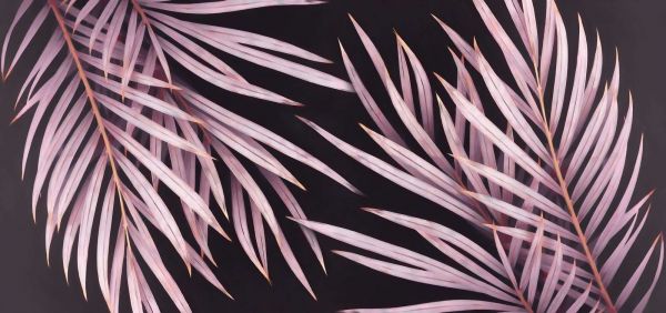 Zwiewne liście palmowe w odcieniach staroróżu i pudrowych barw wyróżniają się elegancko na tle głębokiego, ciemnego tła. Smukłe formy, lekka przejrzystość i ciepłe akcenty nadają obrazowi luksusowy, spokojny wygląd z subtelnym botanicznym charakterem.